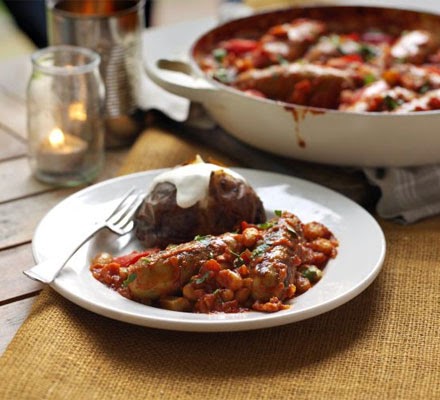 - Meanwhile, heat oven to 190C/170C fan/ gas 5. Toss the sausages with remaining 1 tbsp oil and spread out on a baking tray. Cook for 30 mins until browned all over, turning occasionally. Nestle the sausages among the beans, then cover and place the pan in the oven. Cook for 30 mins more. Remove from the oven, sprinkle over the parsley, if using, and serve with the baked potatoes . Can be made up to 2 days in advance and reheated in a low oven or on the hob.