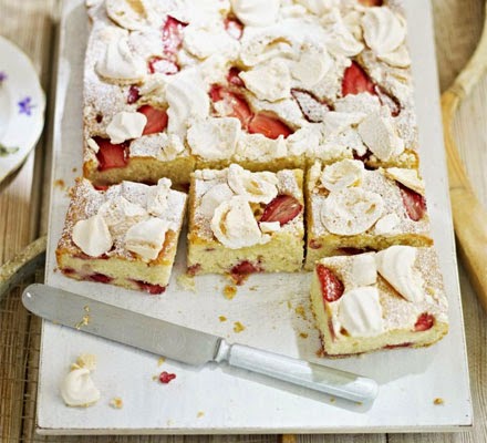 - Scatter the sliced strawberries and meringue over the cake, then bake for 40-45 mins until risen, golden and a skewer comes out clean. Cool for 20 mins in the tin, then transfer the cake to a rack. Just before serving, dust with a little icing sugar. Enjoy with the rest of the double cream, whipped if you like.