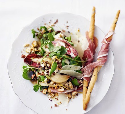 - To make a dressing, combine the olive oil and balsamic vinegar with some seasoning. Toss the salad leaves in most of the dressing, then arrange on serving plates or a platter, layering the leaves with the pear slices. Top with shavings of Manchego and the hazelnut crumb, then drizzle over some of the rosemary honey and the remaining dressing. Serve with Prosciutto twists (see tip, below) for the meat-eaters.