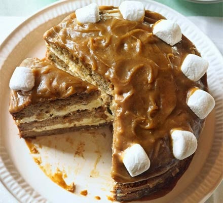- Use a serrated knife to cut the cake horizontally into 3 equal layers. Whip the cream until it forms stiff peaks, then chop the banana into small pieces and fold into the cream, along with the marshmallows. On the first layer, spread a generous covering of the dulche de leche, followed by half of the cream mixture. Sandwich the second layer on top and repeat. Thickly spread dulche de leche over the top of the cake, then arrange extra marshmallows around the edge.